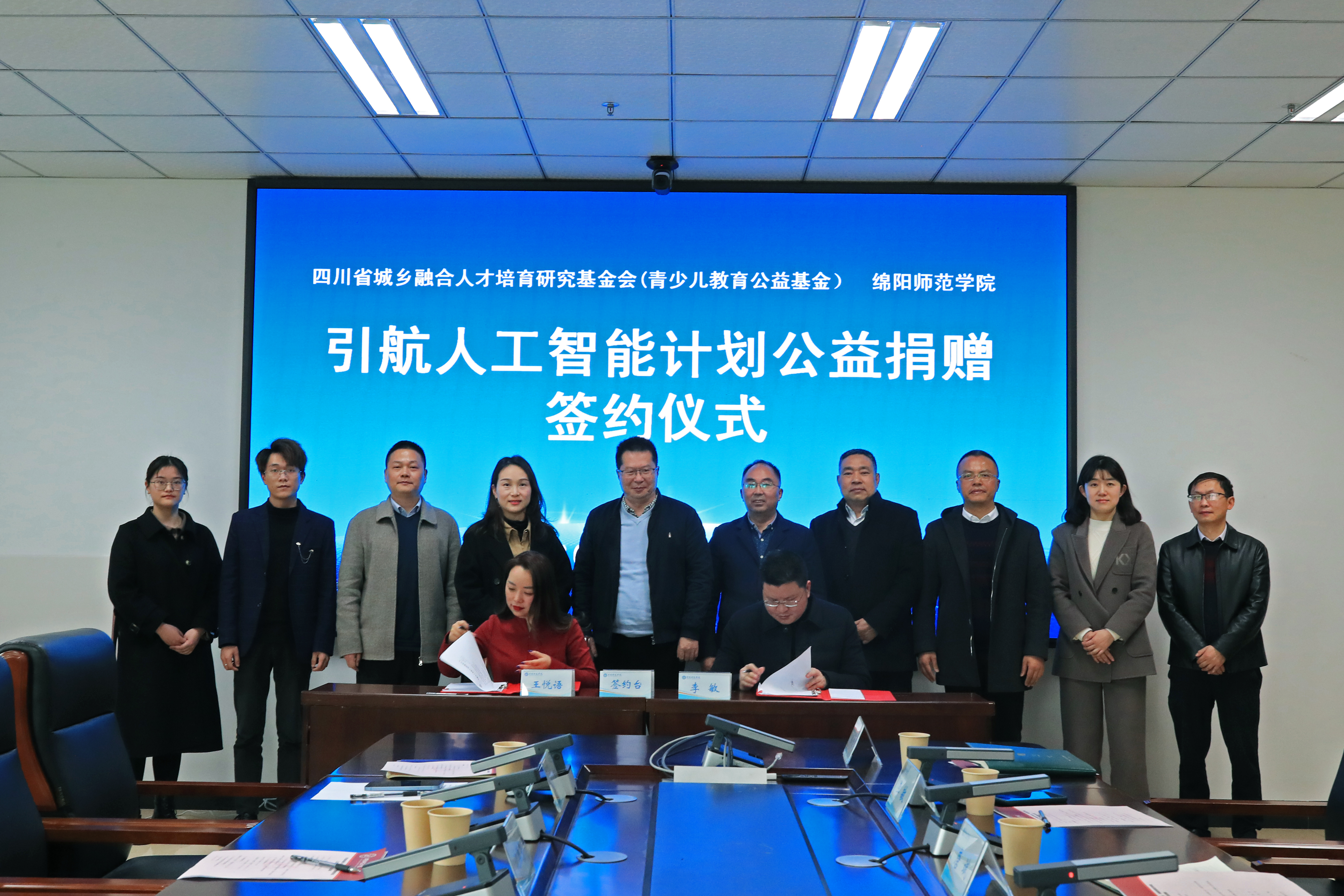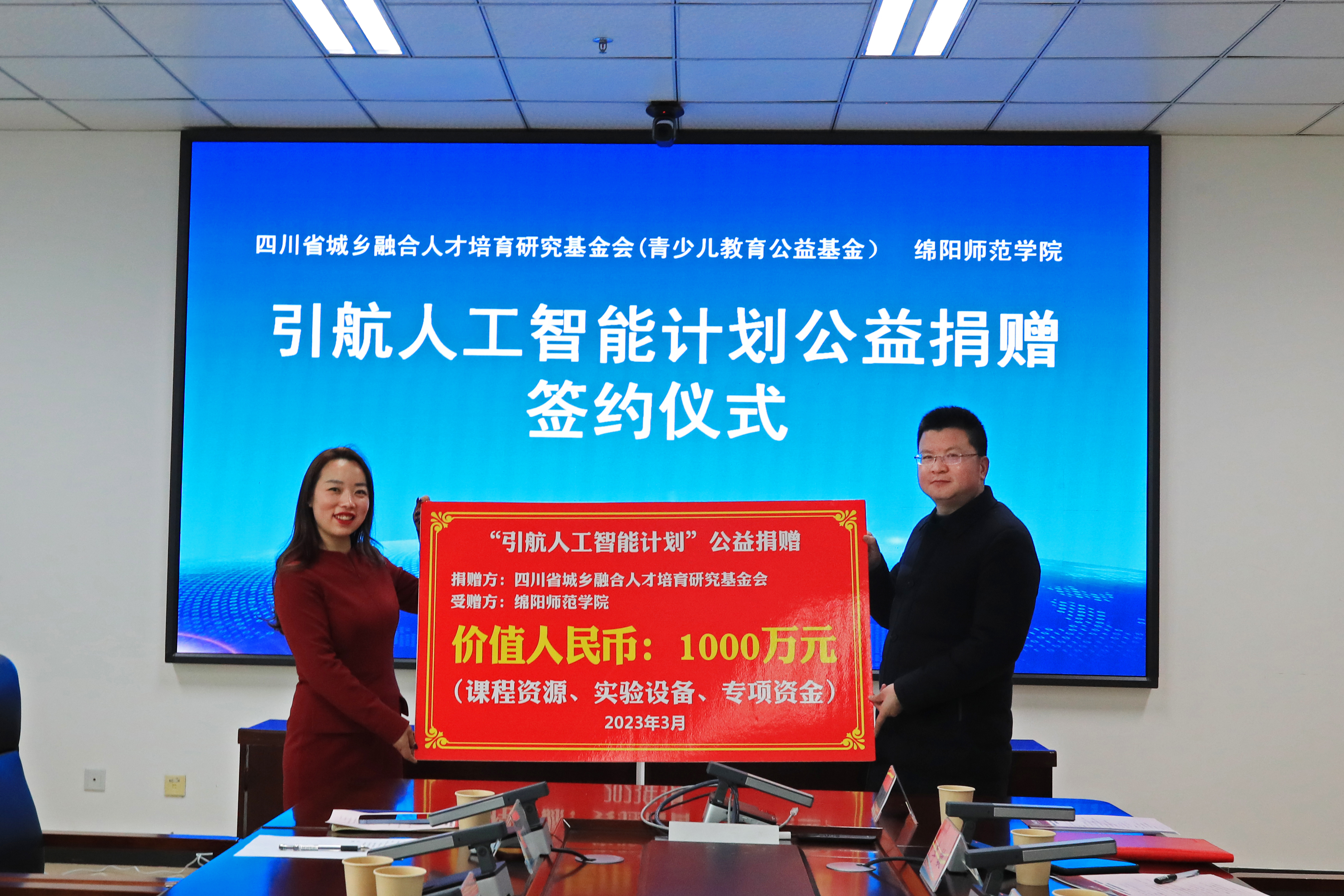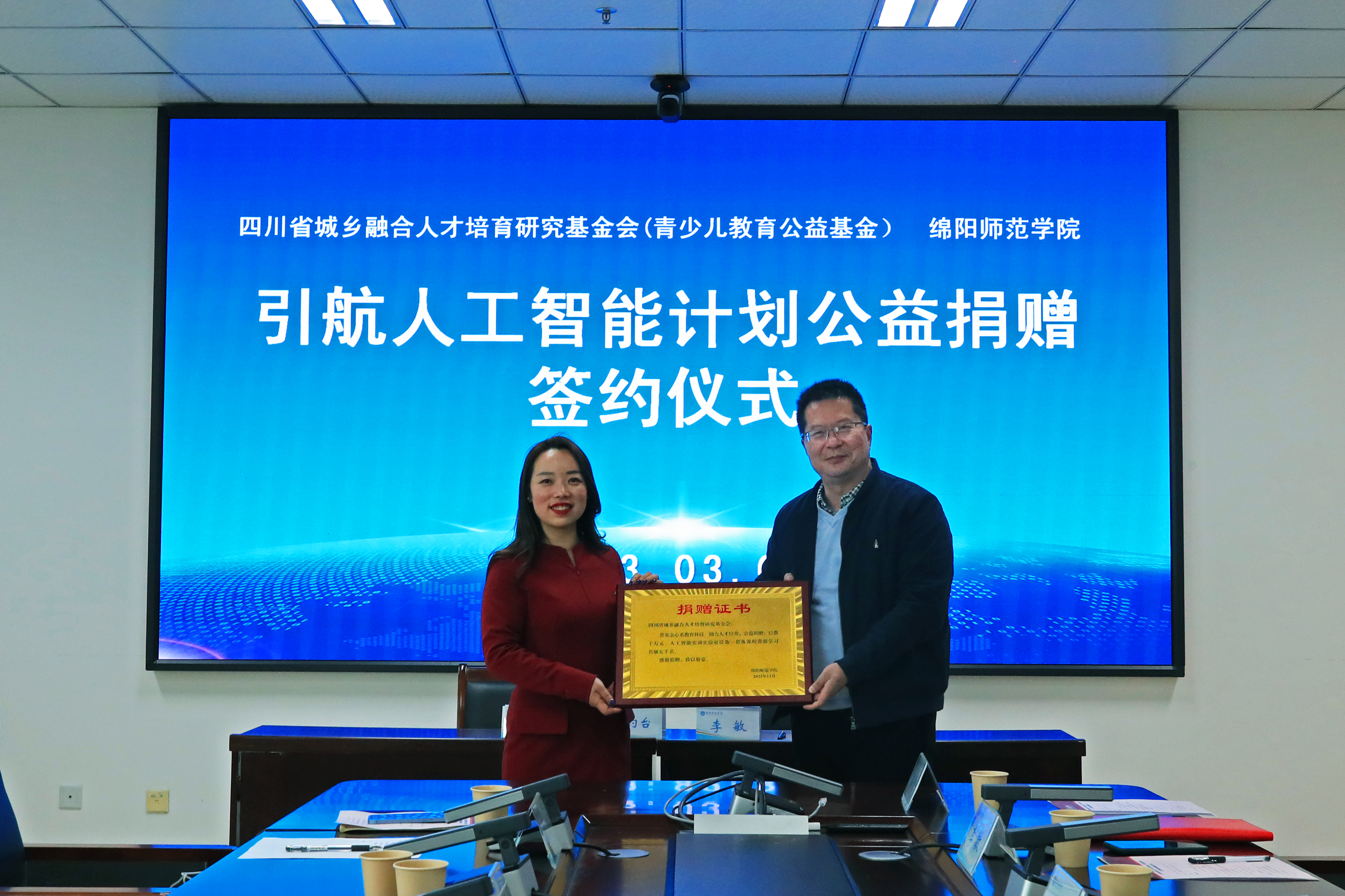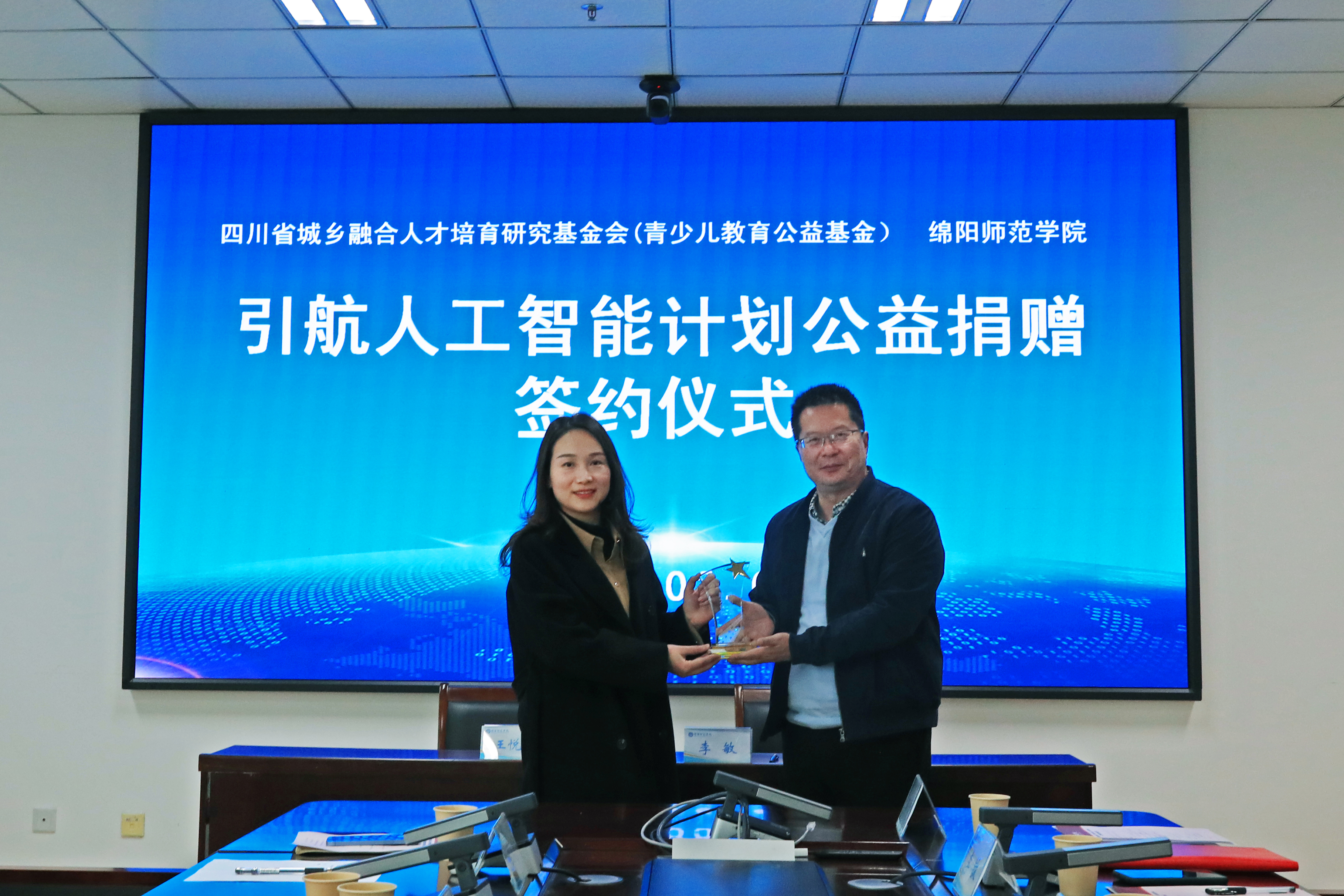3月2日,四川省城乡融合人才培育研究基金会(青少儿教育公益基金)向绵阳师范学院“引航人工智能计划”公益捐赠仪式在学校高新校区举行。捐赠项目包括专项支持资金、人工智能实训实验室建设以及相应课程资源,价值1000余万元。 四川省城乡融合人才培育研究基金会(青少儿教育公益基金)副部长王悦语,成都市诚学长青公益服务中心主任助理沈德芳,引航人工智能计划公益服务中心主任张丽君等捐赠方代表参加活动,副校长何云晓出席捐赠仪式。